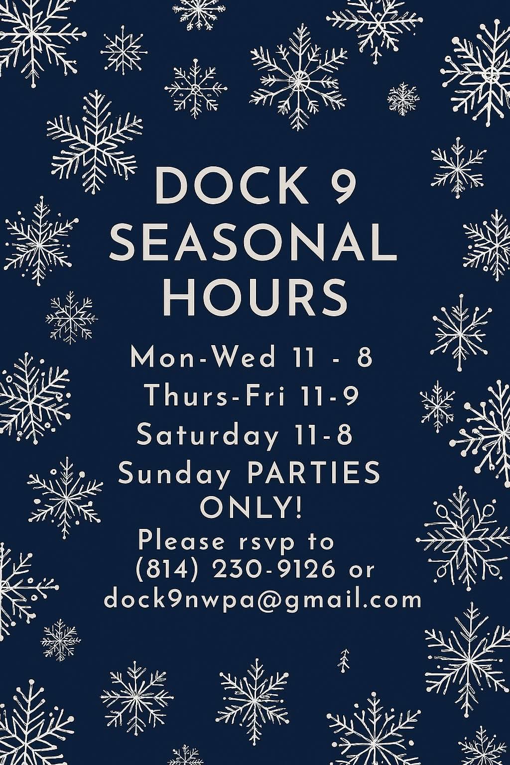 Winter Hours: Mon‑Wed 11a‑8p, Thru-Fri 11a‑9p, Saturday 11a-8p, Sunday, By Reservation Only